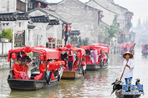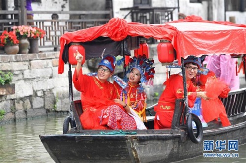 在上海市金山区枫泾镇,新人们参加枫泾水乡婚典(2017年9月22日摄)。 新华社发
