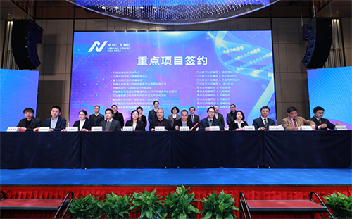 签约仪式上,南京大学鼓楼临床医学研究院、中美消化系统疾病与癌症内窥镜国际诊疗中心、国际老年整合医学服务中心、基因组学大数据平台、南京江北华鑫新型医药制剂产业基金等40个项目集中签约。同时,与会领导还为长三角精准医疗高地、医渡云全国研发中心和创新业务中心、质谱检测与分析中心、未来医院研究院4个项目进行了揭牌,并向11位“三中心一高地”首批专家智库的专家颁发了聘书。