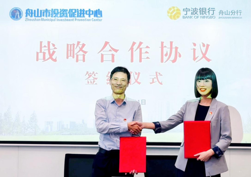 签约仪式中,市投促中心副主任俞骥科、宁波银行舟山分行副行长邱楠代表双方签订战略合作协议。
