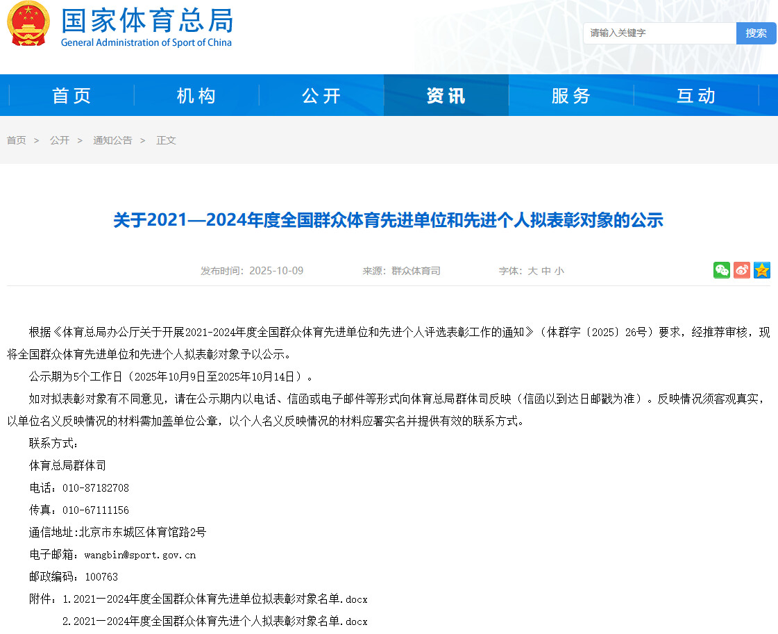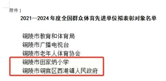 10月9日,国家体育总局群体司公示了2021—2024年度全国群众体育先进单位和先进个人拟表彰对象名单,铜官区2单位光荣上榜。