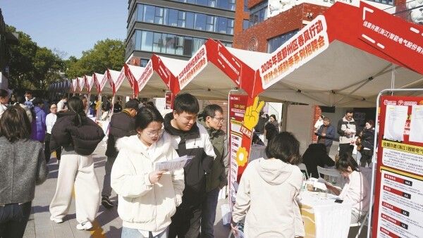 应届毕业生许同学刚和一家企业聊完:“这场招聘会就在学校旁边,太方便了!”他说,“我是附近万里学院的学生,学的是软件开发专业。想一步到位找到满意的工作不太容易,所以我现在对薪资待遇没有太高要求,先解决就业,其他的慢慢来。”