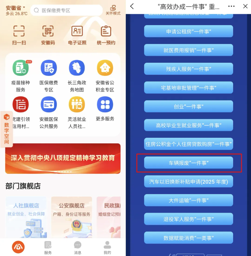 家里的老车开了很多年,零件时不时出问题,维修也越来越费劲,不少车主想要购买新车,但对于如何处理“老伙计”总是一头雾水,甚至因为怕麻烦,直接把报废车私下当废铁卖掉,这是典型错误示范!今天就带大家详细梳理机动车报废注销的全流程要点。通过车辆报废“一件事”告别繁琐流程,足不出户就能解决,车辆报废“一件事”线上办理在“皖事通APP”即可进行。