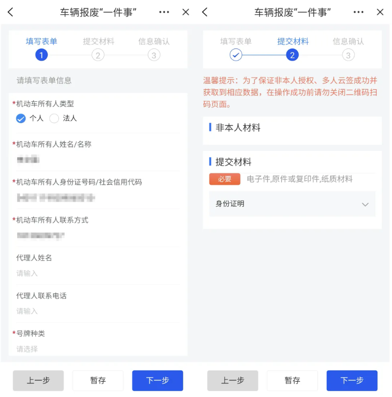 3、核对系统带入的车主身份信息,填写拟报废车辆信息、按照页面提示上传相关材料,在线提交申请。