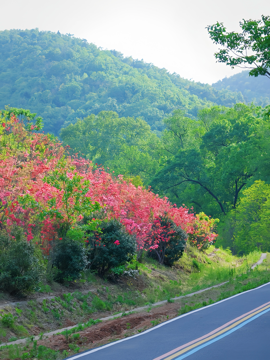 远远望去,像谁把调色盘里的红色都倒在了老山上,红得热烈,与背后树木的绿形成鲜明反差。