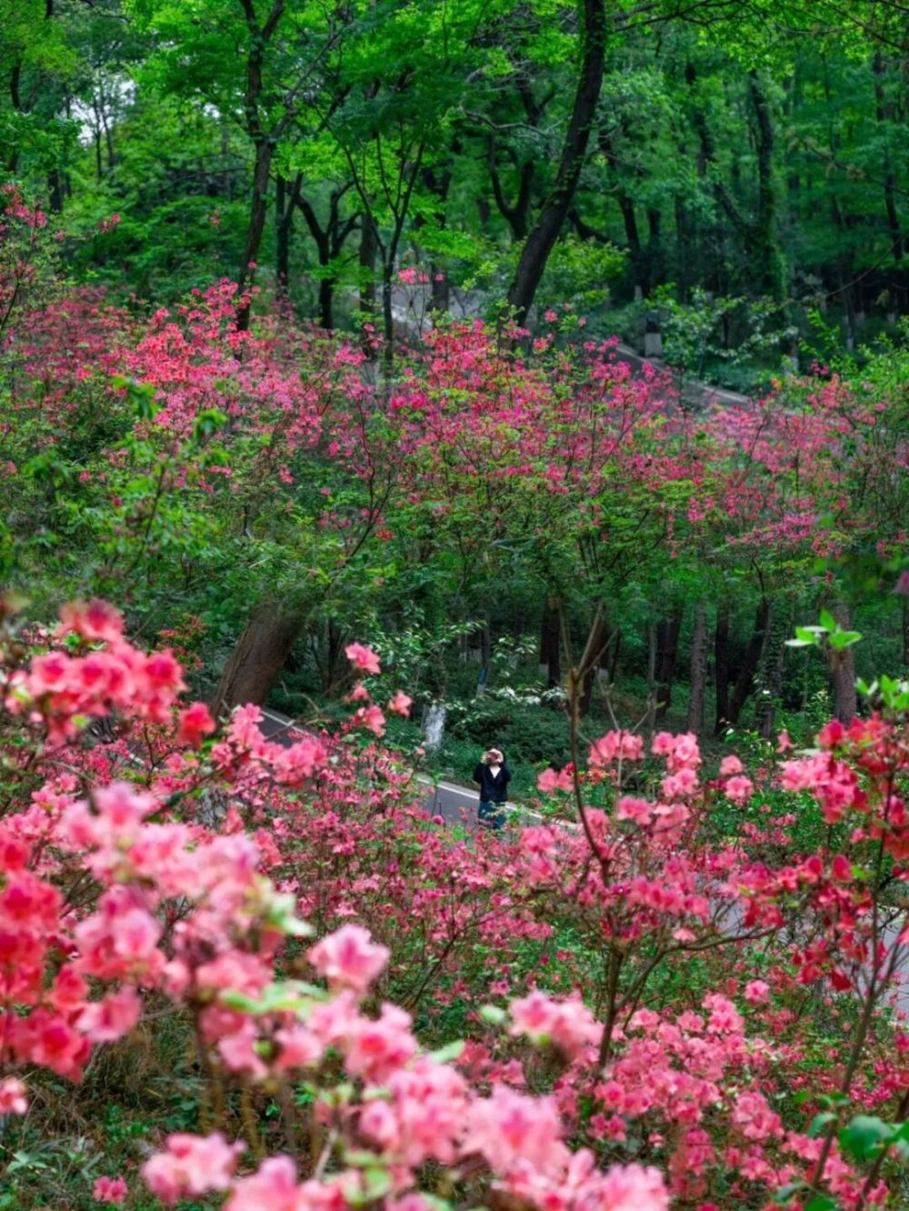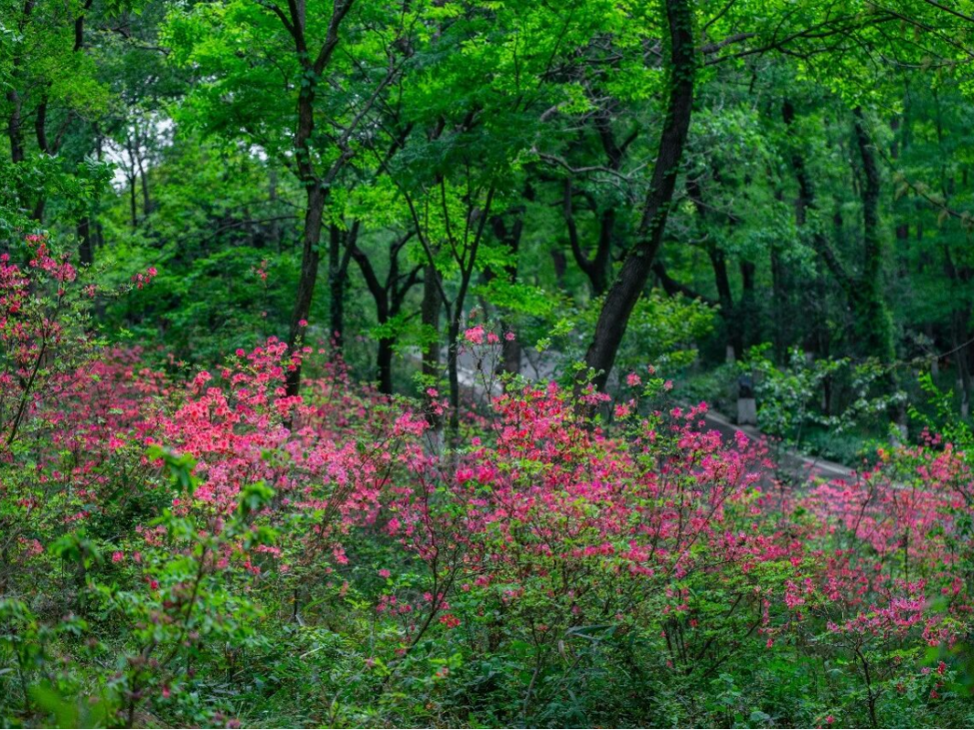 从公园西门进入,沿着登山步道往上走,路两边不时能看见映山红,三五丛或一小片,点缀在步道两侧的林间,不像匪集场那样铺天盖地,却别有一种山野趣味。
