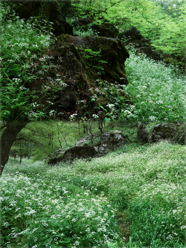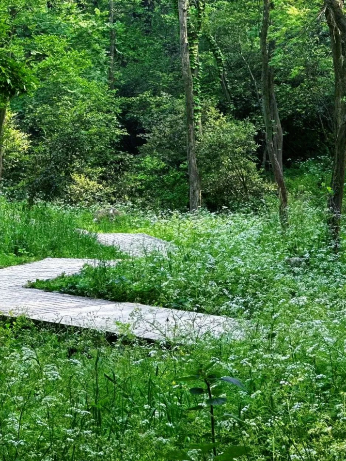 在老山,看峨参花最好的地方是吴家大洼。从牌坊走进去,路两边密密匝匝全是小白花,一簇一簇的,蓬松又柔软,像给山坡铺了一层碎花布。