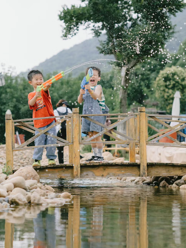 老山脚下的不老村,白墙黛瓦,溪水穿村而过,适合带孩子待上大半天。村中的儿童乐园里可以玩滑梯、蹦床和小火车,想动手的话还能体验非遗蓝染、捏陶泥或做披萨。吃饭就去村里的农家菜馆,也可以预约一场自助烧烤。