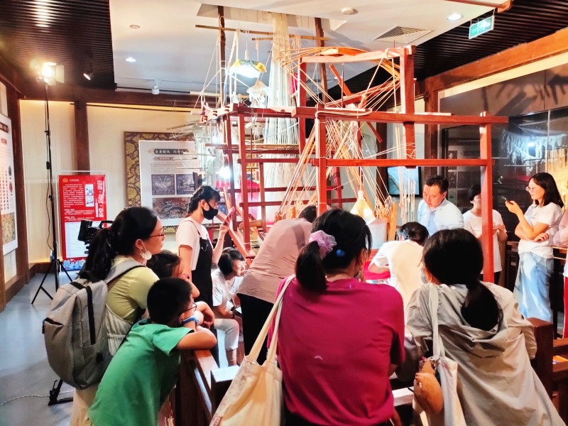 周大师向学员们介绍了云锦大花楼提花木织机的构造、“拽花工”与“织手”的工作方法,并现场解答学员们的各种问题。