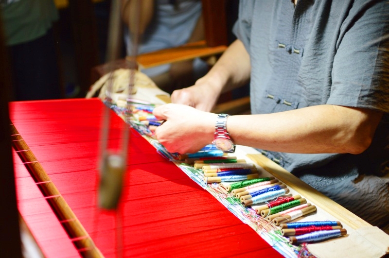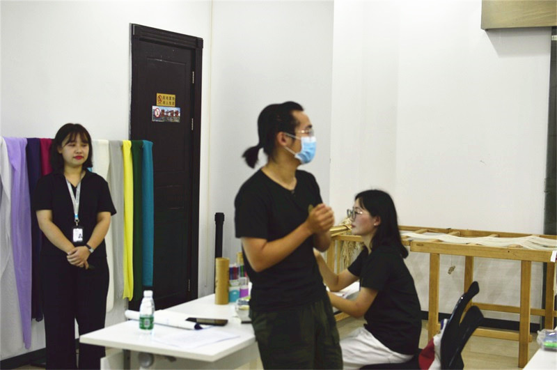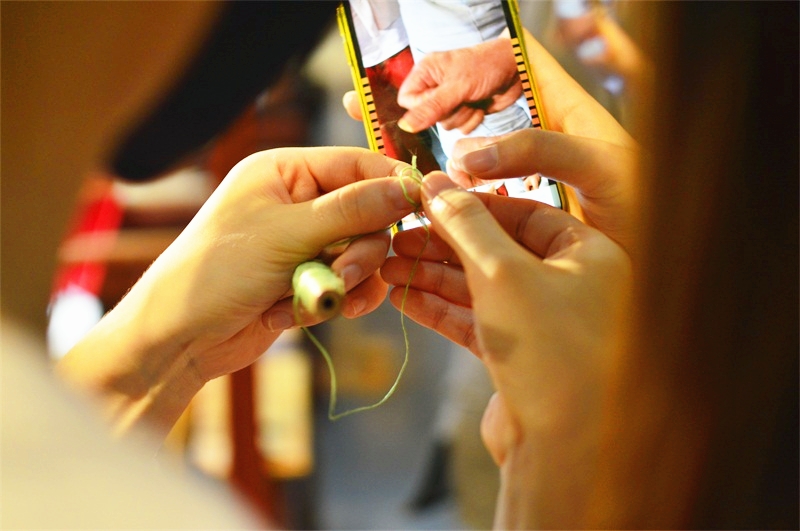 上机体验的同时,周大师也传授学员打结的工序,周大师说:“学好云锦纺织,第一步就要学会打结”。
