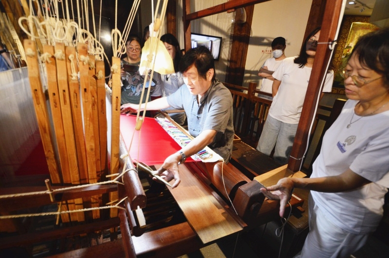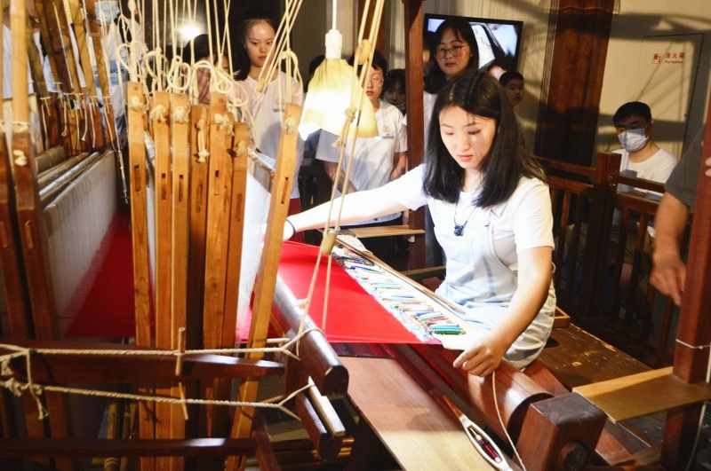 根据周大师通俗易懂、诙谐幽默的“十字口诀”,学员们登上4米高的“云锦大花楼提花木织机”开始学习如何织锦。