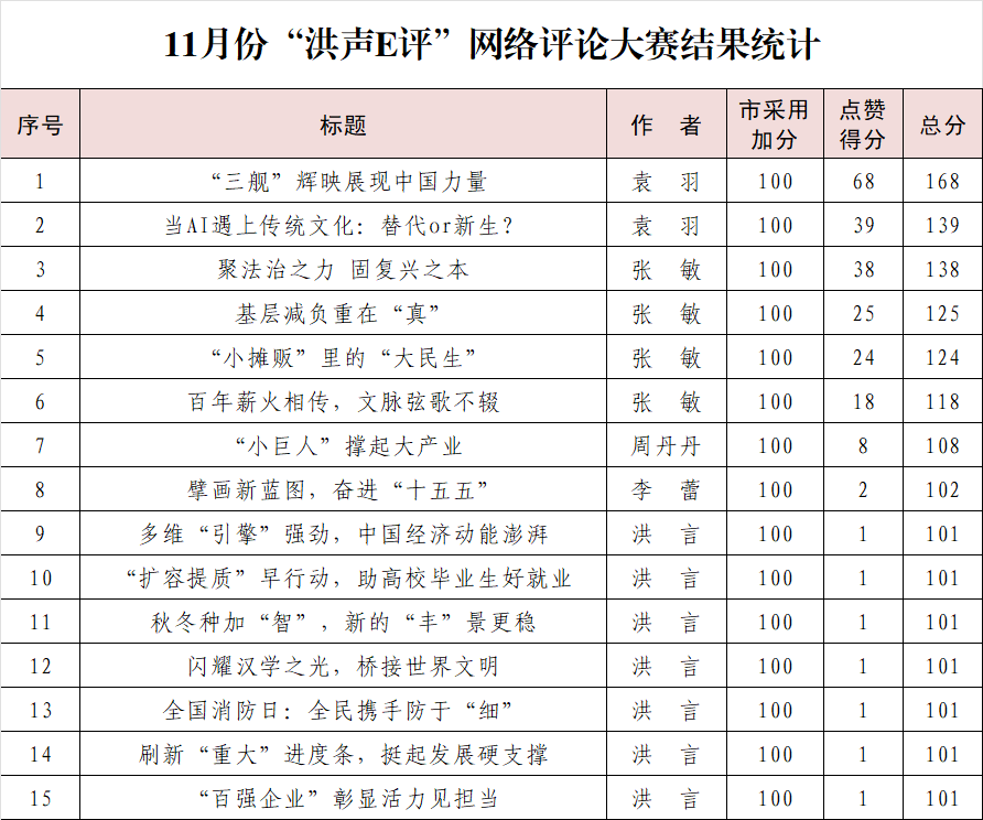 根据评分规则,11月份“洪声E评”网络评论大赛一等奖、二等奖、三等奖名单如下: