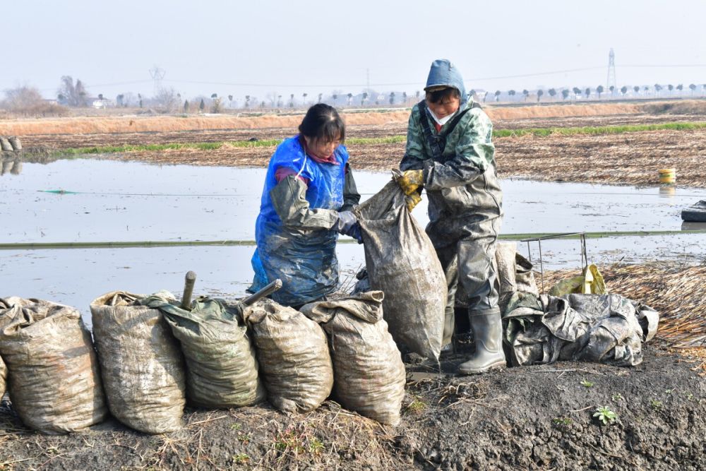 冬至时节,气温骤降。在巢湖市坝镇联河村新屋自然村头的荸荠田头,种植大户朱志俊和爱人徐经花正忙碌着将一袋袋刚采收的荸荠,合力搬上平板履带车。不一会儿,平板车就装满了,两人额头处也微微冒出汗。