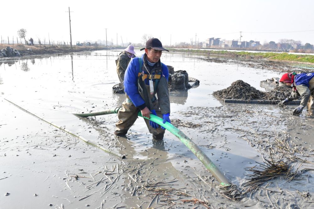 朱志俊夫妻俩在坝镇联河村种植荸荠已有10多年时间了,每年的种植面积都在100亩以上。“以前采收荸荠是真辛苦。”种植大户朱志俊站在田埂上,望着正在水田中作业的工人们感慨道,“全靠人工一锹一锹地挖,猫着腰在泥里摸。一个人一天下来,也挖不了多少,还累得腰都直不起来,荸荠也容易被铲破。”