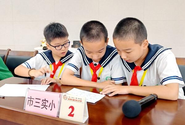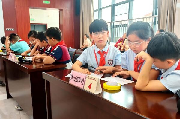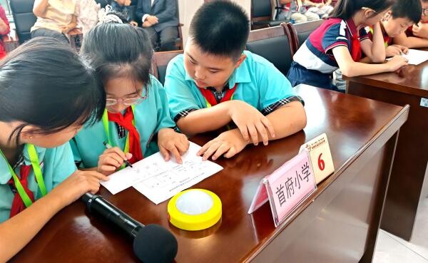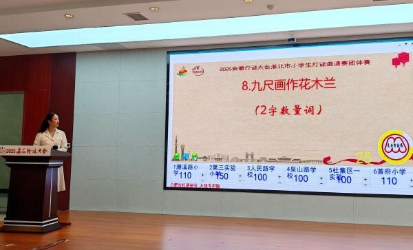 面对“万仞千峰赤焰烧”(打一2字淮北地名)”的谜题,选手们迅速答出“烈山”;面对“让他三尺显器量,宰相回诗人赞扬(打一2字修辞方式)”的谜题,选手们迅速答出“夸张”;面对“两根麻花一只梨(打一3字网络招呼语)”的谜题,选手们迅速答出“886”。赛场上,小选手们或凝神思考、或果断抢答,金句频出、妙语连珠,引得现场掌声雷动。