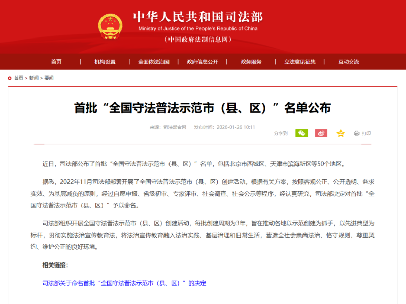 1月26日,中华人民共和国司法部官网发布首批“全国守法普法示范市(县、区)”名单,湾沚区成功跻身全国50个名额之列,荣获首批“全国守法普法示范市(县、区)”称号,系全省唯二,全市唯一。