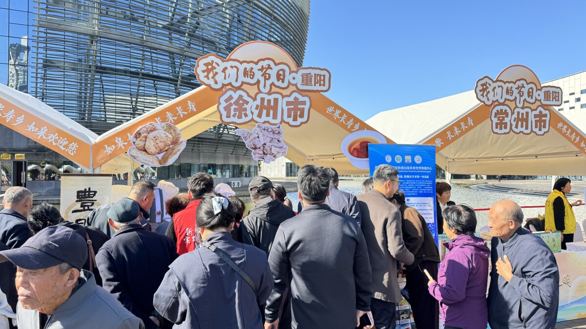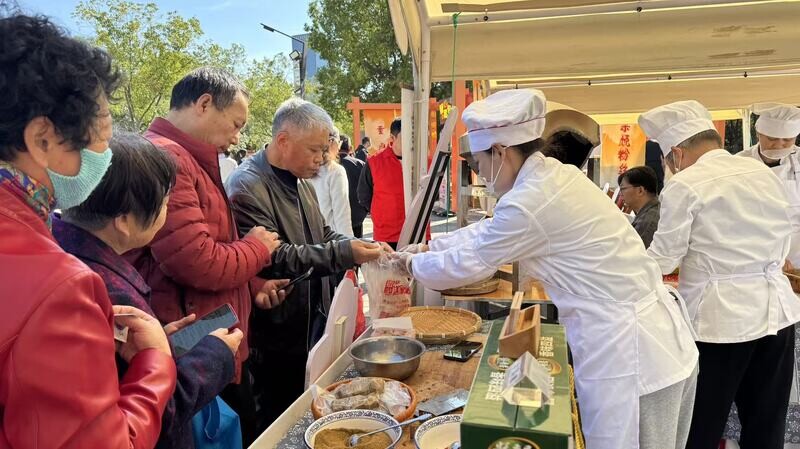 摊位前,迅速汇聚成一条蜿蜒的长龙,与其他展位形成了鲜明对比,为此次重阳佳节增添了一抹独特而诱人的烟火气息。