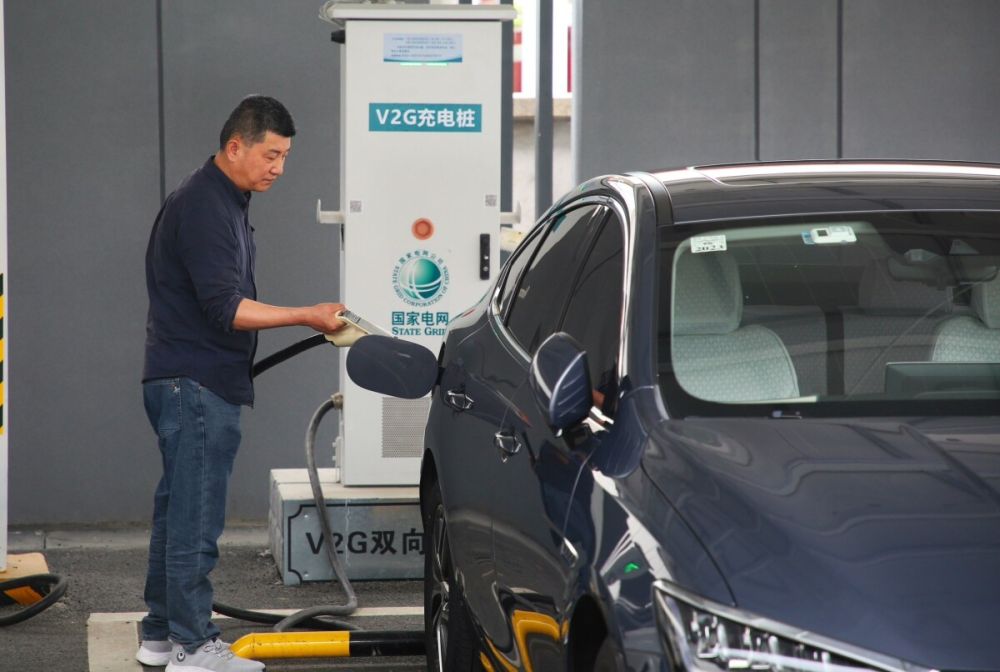 近日,在合肥市政务中心新能源汽车充电站内,工作人员协助市民左先生使用V2G双向充放电桩,将新能源汽车电池中储存的电量反向输送至电网。