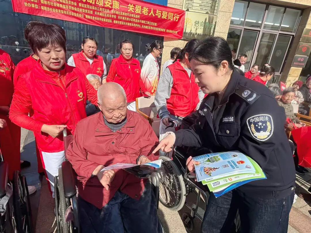 10月29日,铜官区司法局长江路司法所、天井湖社区及铜陵市社会体育指导员协会联合主办“情暖夕阳红舞动颂安康——关爱老人,与爱同行”文艺表演,普法工作人员化身“暖心使者”,为每位老人送上诚意满满的“法治大礼包”。(铜官区司法局 叶元元)