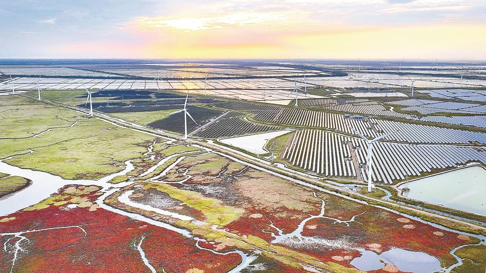 在江苏盐城,一望无际的平原上四处可见通体洁白的风力发电机,巨大的叶片随风缓缓转动;一片片光伏板整齐排列,在阳光照射下熠熠生辉。