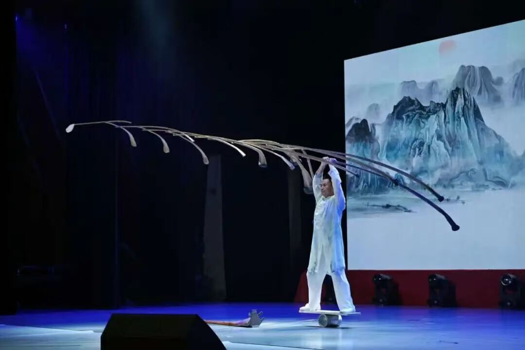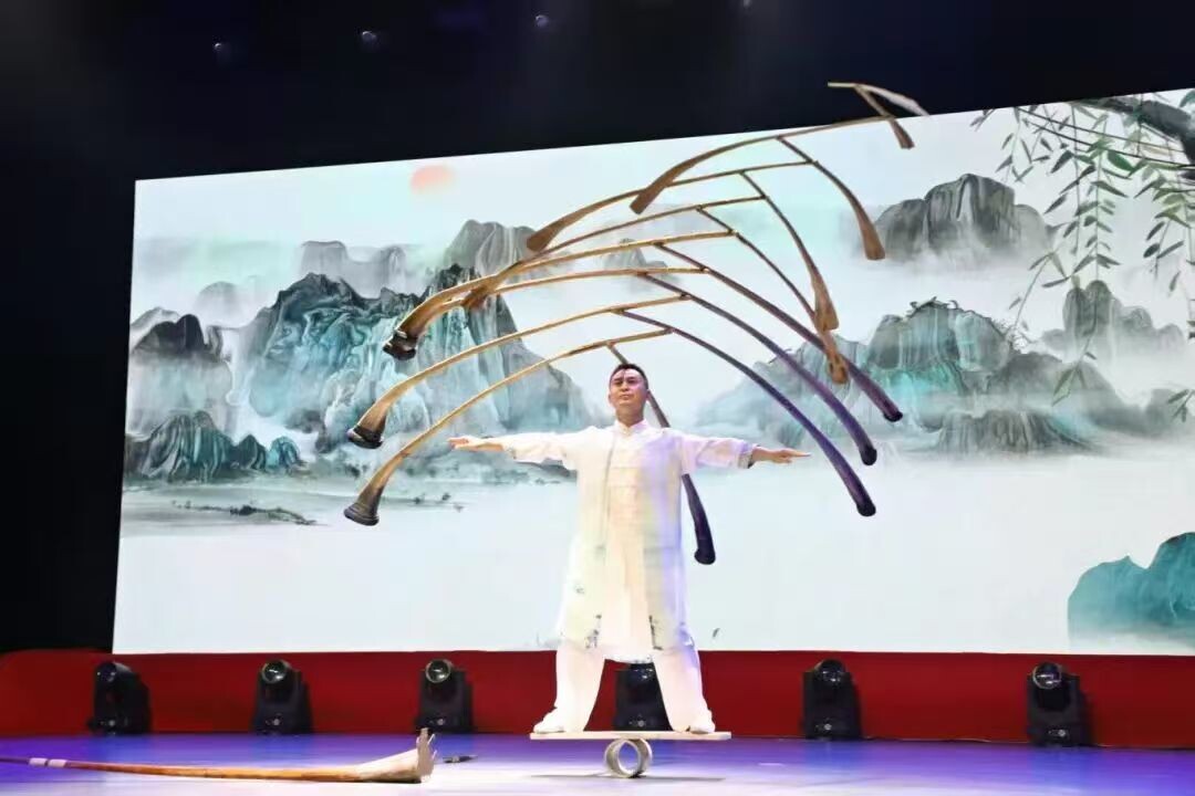 现场表演中,赖光永先以“一指禅”顶起七根树枝,紧接着用剑尖挑起十一根树枝,并用下颚稳稳托住,展现惊人的平衡力。随后,他将十五根棕榈枝叠加在一根轻盈的羽毛上,双脚立于晃板之上,完成双手、单手托举,甚至将羽毛置于头顶,整个结构摇摇欲坠却始终不倒。最终,他轻轻吹落羽毛,所有平衡瞬间瓦解,树枝散落一地,唯有羽毛悠然飘落,将“柔中寓刚”的中国美学与生命哲思推向极致,为本次交流展演写下高光一笔。观众席先是一片寂静,随即爆发出雷鸣般掌声,经久不息。