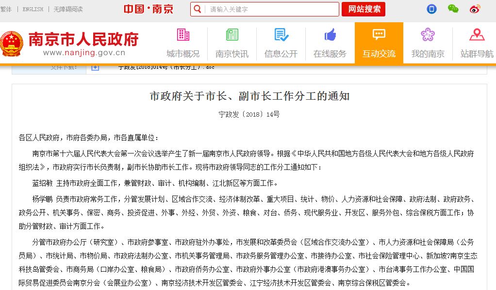 今天,记者从中国南京网获悉,南京市政府公布了关于市长、副市长工作分工的通知。通知全文如下: