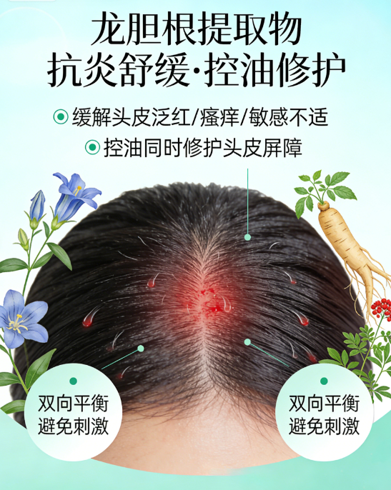 专利修护成分:龙胆根提取物(专利号ZL201710183506.4)协同丁二醇,舒缓头皮,修护因过度清洁受损的头皮屏障,补充头皮水分,避免清洁后头皮干涩、紧绷,让头皮保持清爽水润,减少油脂反弹分泌。