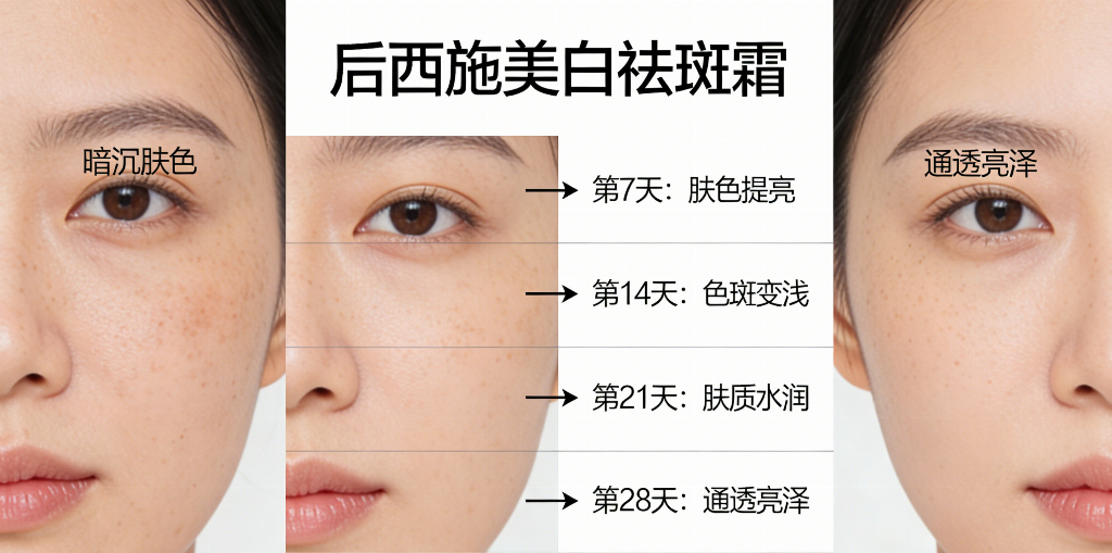 坚持每日早晚洁面、基础补水后,取适量后西施美白祛斑霜均匀涂抹于面部,重点在色斑区域轻轻按摩至完全吸收,简单易操作,无需复杂护肤步骤,适配快节奏生活。多数使用者反馈,坚持使用 28 天左右,即可感受到肤色提亮,色斑开始淡化;持续使用 8-12 周,顽固色斑明显变淡,肌肤整体通透度大幅提升,效果直观可见。