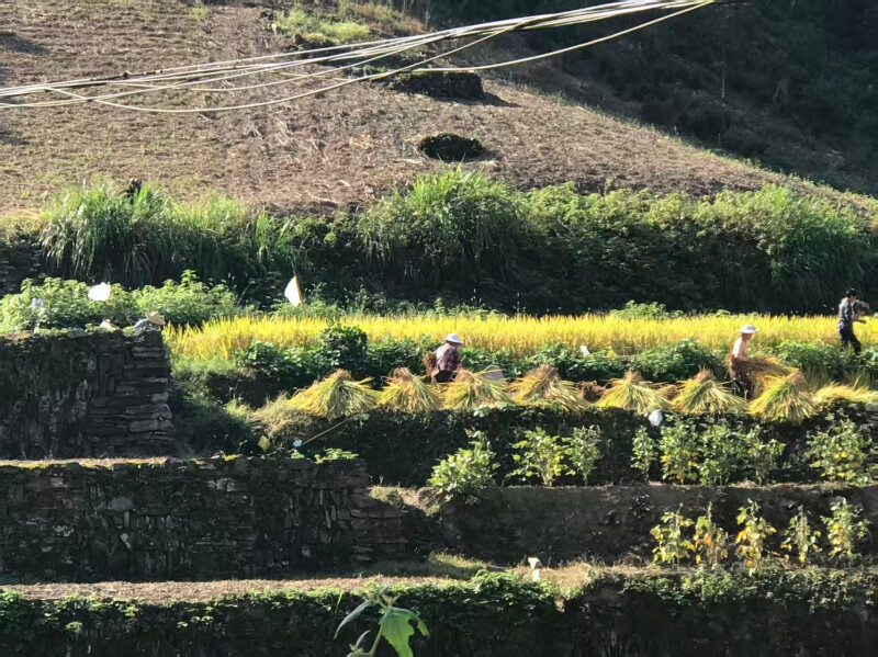 金秋时节,位于黄山市海拔最高乡镇的金川乡查坑村一派稻田收割的景象。在查坑源河畔,农民们正手持镰刀,穿梭在金黄的稻田之间,将金灿灿的稻粒揽入“怀中”。即使在科技飞速发展的今天,这里仍然采用传统的人工收割方法:镰刀收割后,农户们脚踩打稻机,手扶着一束束稻子进行手工脱粒,再装袋运输。在全村20亩水田里,处处洋溢着丰收的喜悦。