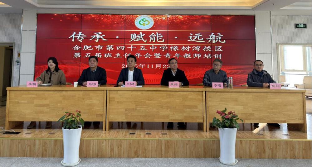 冬日熹微,赴一场教育之约。传承赋能,点一盏前行明灯。2025年11月22日,合肥市第四十五中学橡树湾校区第五届班主任年会暨青年教师培训活动于合肥市第八中学匡河校区盛大启幕,并圆满礼成。本次活动以“传承·赋能·远航”为主题,淮南市教育局德育处李韦遴处长,合肥市第八中学章伟校长,合肥市庐阳区教育体育局督导室李睿主任和教研室李霞主任,合肥市第四十五中学橡树湾校区胡茂侠书记、何钧校长、高中副校长、吕德军副主任、团委葛平平书记、苏黄修副主任、李昆副主任、全体班主任和青年教师,共赴一场教育智慧与育人情怀的深度对话。