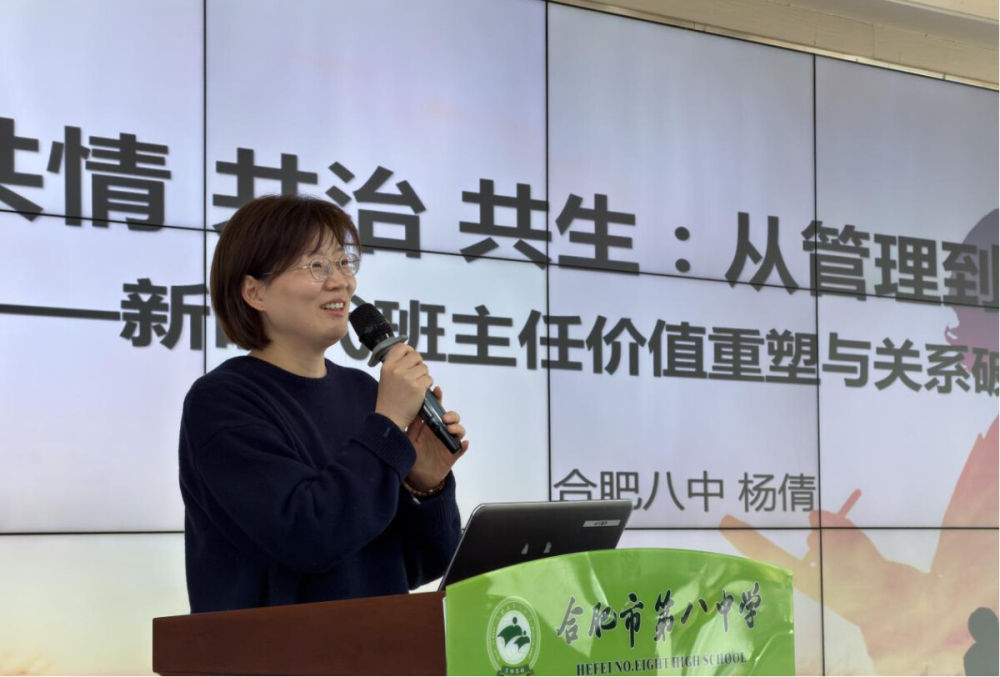 下午的专题研讨环节思想碰撞、火花四溅。合肥市第八中学高二年级部德育主任杨倩以《共情 共治 共生:从管理到赋能——新时代班主任价值重塑与关系破局》为题作专题报告。