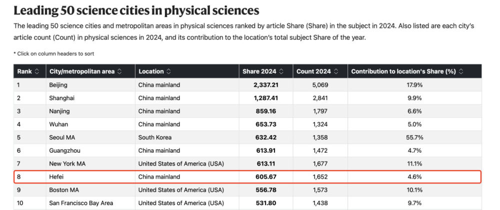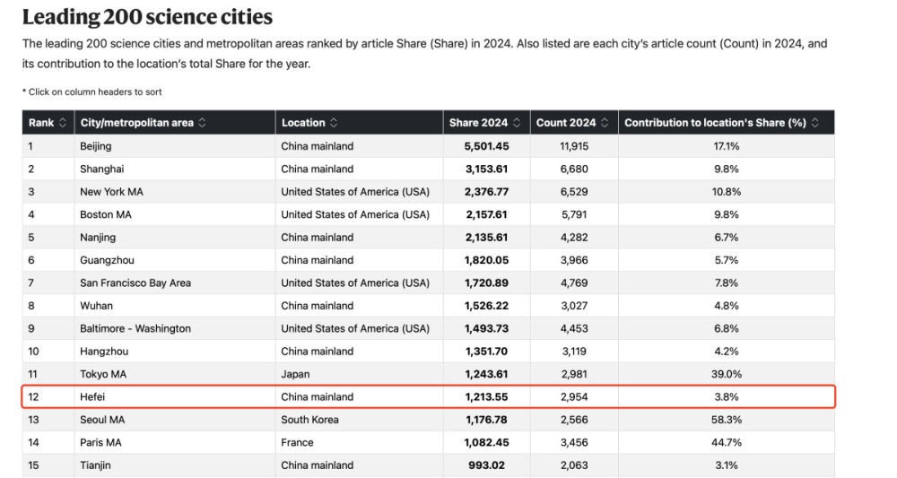 11月16日,施普林格·自然在线发布《自然》增刊“2025自然指数—科研城市”,聚焦全球主要城市及都市圈在2024年自然指数(Nature Index)追踪的高质量期刊上的科研产出变化。最新榜单中,合肥位列全球第12位,比上年提升3位;在“十四五”期间跃升8位,创造了历史最好成绩。