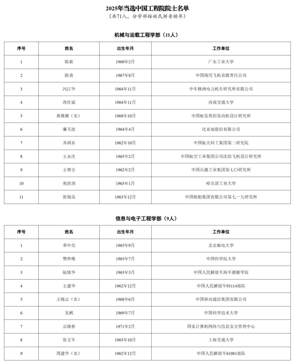 中国科学院、中国工程院11月21日公布2025年院士增选结果,分别选举产生中国科学院院士73人,中国工程院院士71人。