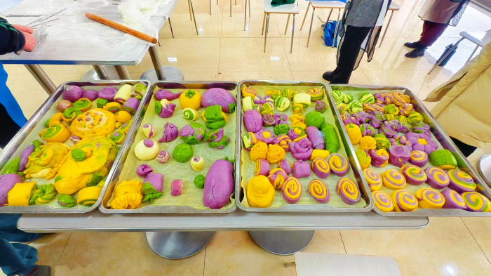 活动当日,各项安排紧凑有序、亮点纷呈。上午9:30分,孩子们齐聚单位食堂,化身“小小美食家”,积极参与蒸花馍、包饺子年俗体验。在食堂阿姨的指导下,他们挽起衣袖、揉面、塑形、捏花、包饺子,一双双小手忙得不亦乐乎,食堂内弥漫着面粉的清香与欢声笑语。经过大家的共同努力,形态可爱的花馍、饱满圆润的饺子陆续出锅,孩子们不仅体验了劳动的乐趣,感受了传统年俗的魅力,还能将亲手制作的美食带回家,分享劳动成果与节日喜悦。