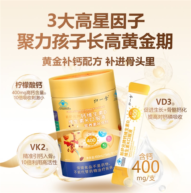 2.儿童发育迟缓、身高焦虑、免疫力差,建议优先归一食液体钙,协同成分提升吸收率和骨量,持续补充提升身高改善挑食。