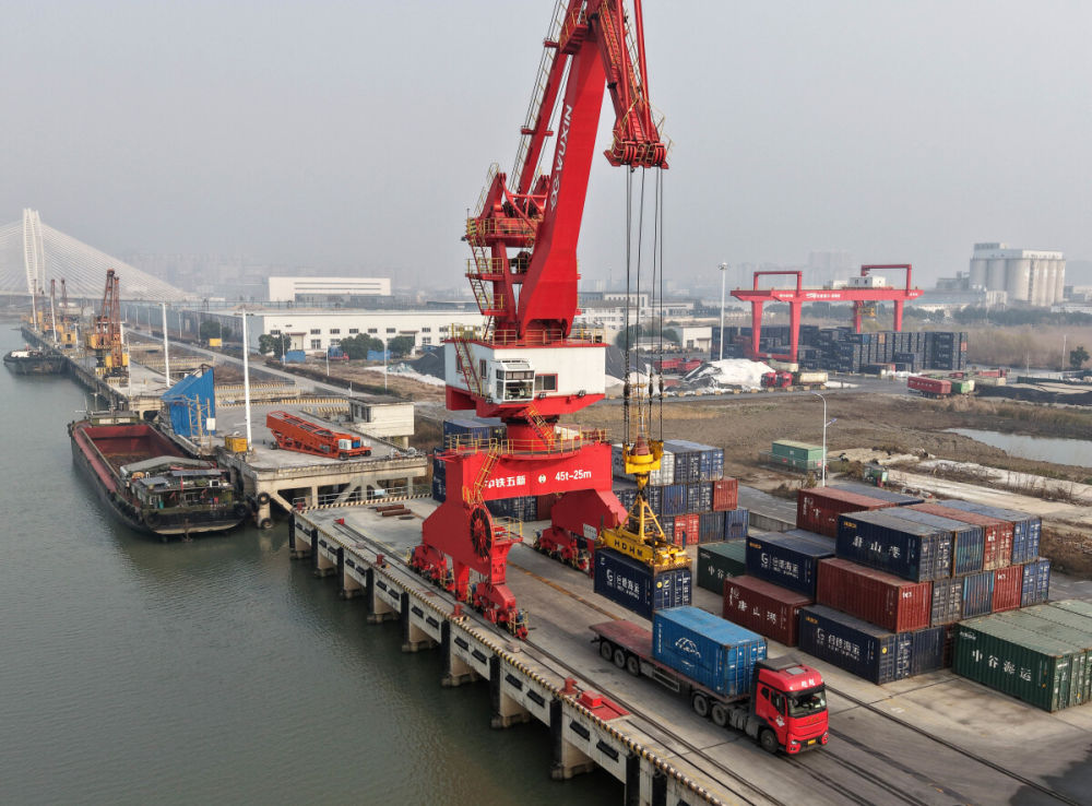 12月17日上午,记者在巢湖港作业现场看到,凛冽寒风中,码头岸线秩序井然,大型门机舒展吊臂精准装卸集装箱,集装箱卡车穿梭不息、轰鸣不断,装卸工人各司其职、干劲十足。泊位边,货轮有序停靠开展装卸作业;堆场上,各类货物码放整齐,等待装船外运。