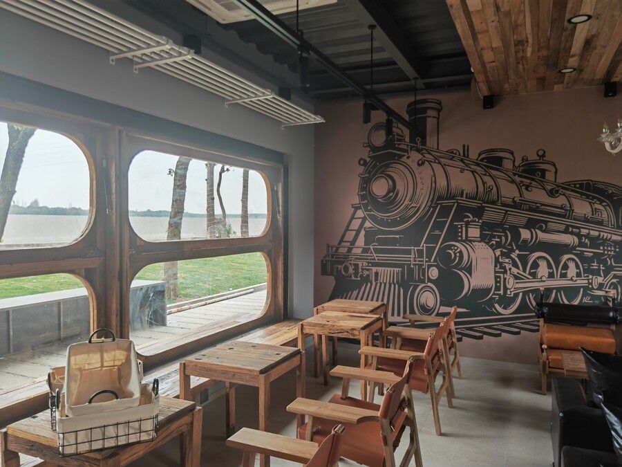 走进公园大门,首先映入眼帘的是篮球场、足球场等运动场地。一路往里走,右侧有铁路文化展示长廊,左侧有室内乒乓球和台球馆,尽头处的江畔设置了一节老式的绿皮火车车厢,供大家参观与休息。沿着江畔绿地漫步,则能看到一排滨江书屋和一家咖啡馆。