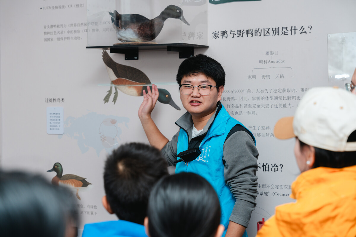 户外结束后,参与者进入科普馆。湿地植物图鉴、鸟类标本、迁徙路线示意图……讲解员告别“讲课式”,更像聊天:“潜鸭为什么叫潜鸭?”“因为你刚刚看到它潜下去了嘛。”