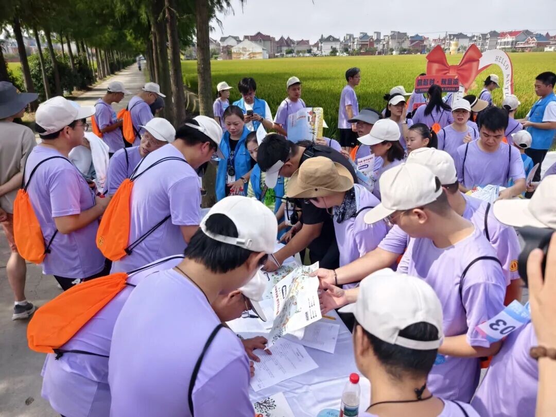 上午9点钟,徒步赛在海星村大草坪宣告开启。参赛运动员井然有序,分批次从拱门出发,沿着平整干净的乡间小路结伴而行,前往一个又一个任务点打卡。虽然天气有点炎热,但6公里长的乡间赛道蜿蜒美丽,沿途不仅有苍翠的水杉、静静的小河相伴,参赛者还能穿行于金黄色的稻田,并不时遇到美丽婀娜的凌霄花、翠芦莉等各种花草,美丽乡村独有的田园风情让参赛者流连忘返。