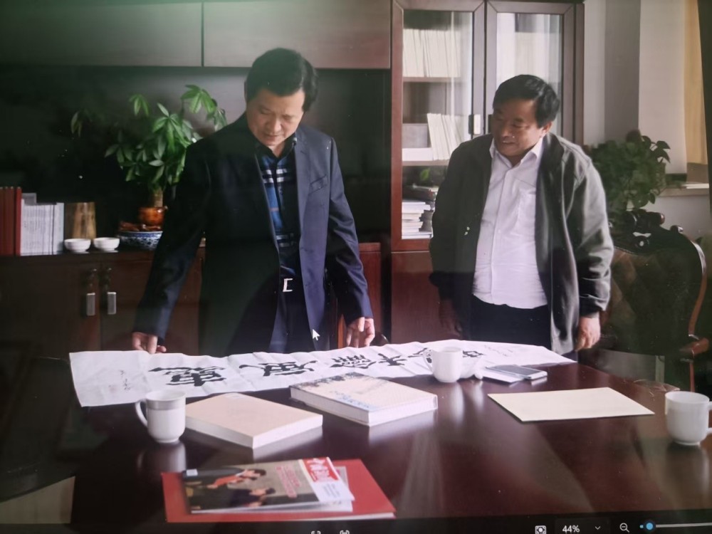 2014年4月中旬在南京,夏宝国(右)向中国书法家协会原副主席言恭达(左)请教并切磋书法创作布局