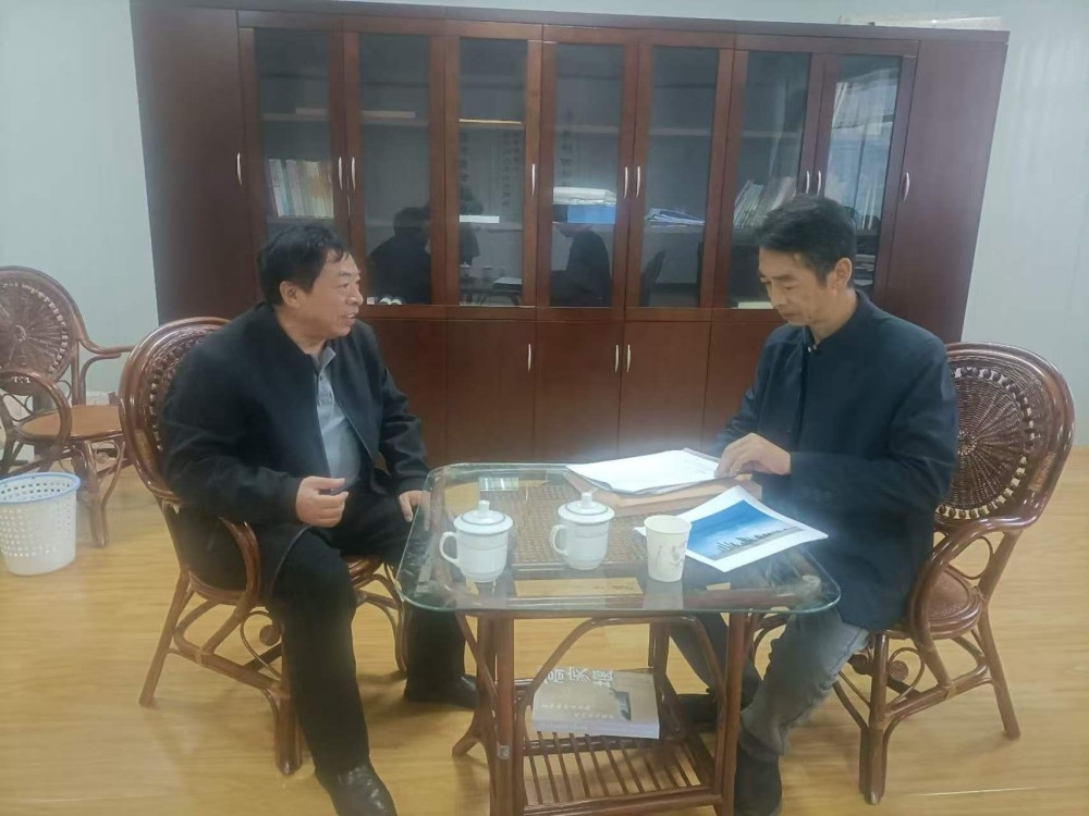 2024年11月13日夏宝国(左)应约接受新华社记者采访,介绍洪泽湖文化研究成果