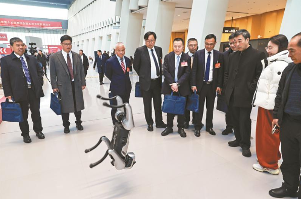 创意展演区则为严肃的两会氛围,添上了一抹灵动的科技暖意。魔法原子的四足机器人“小麦”时而灵活翻跟头、时而亲昵互动;一旁梁元创新科技带来的智元人形机器人远征A2以及灵犀X2同步登场,丝滑扭动肢体关节、踏歌起舞。互动体验区内,优奇智能携手优必选Walker S2与参观者玩转“写字识别”小游戏,无界探索钢镚B-001化身“智能问答官”,用通俗话语架起科技与大众的桥梁。