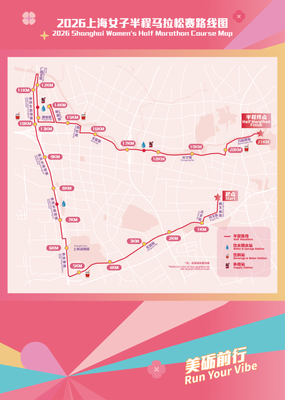 凝聚前六年的经验,2026上海女子半程马拉松赛的赛道延续了往年的经典路线,从现代和繁华的虹桥经济技术开发区启程,途经人文底蕴深厚的虹桥路、自然风光优美的长宁外环生态绿道、园与城一体的苏州河长宁段步道,最终抵达焕发新生的“百年公园”——中山公园。