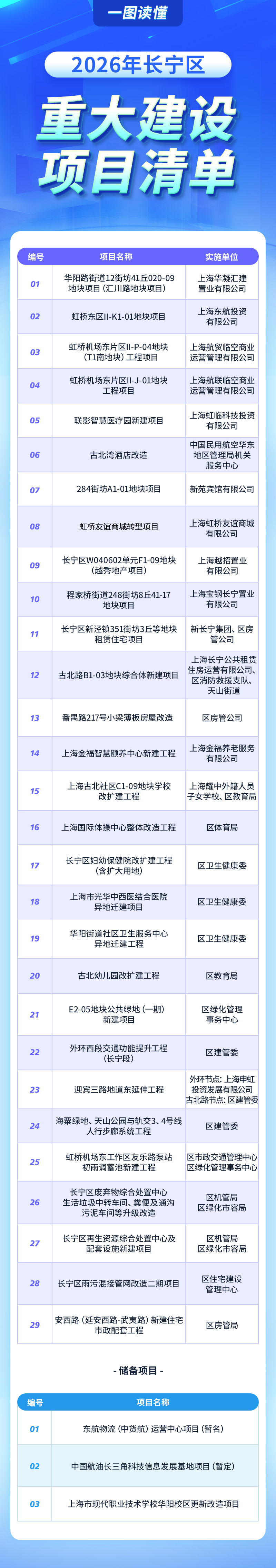 为切实推动长宁区重大项目早落地、早开工、早见效,近期,区重大办制订并发布《2026年度长宁区重大建设项目清单》。今年,长宁区有哪些重大建设项目?“宁宁”带你一图读懂→