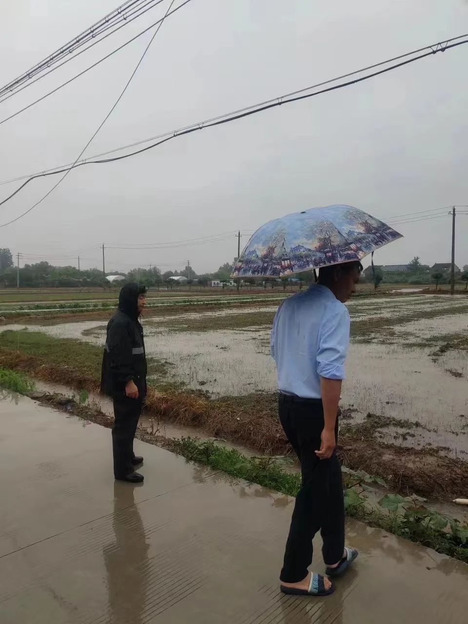 马桥镇经伦村工作人员查看农田沟渠畅通情况,确保农田积水及时排出。