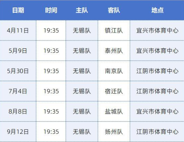 3月8日,市体育局公布了2026江苏省城市足球联赛无锡队主场比赛的时间和场地安排。循环赛阶段无锡队的6个主场比赛全部安排在周六19时35分开赛,宜兴市体育中心和江阴市体育中心各承担3场比赛。