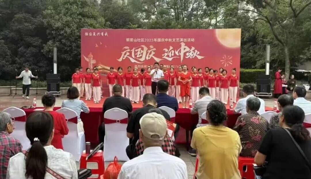 9月28日,铜官山社区举办“庆国庆・迎中秋”主题文艺演出,社区老年学校及文艺爱好者带来大合唱《松花江上》、舞蹈等节目,营造和谐社区氛围。(铜官山社区 蒋妘)