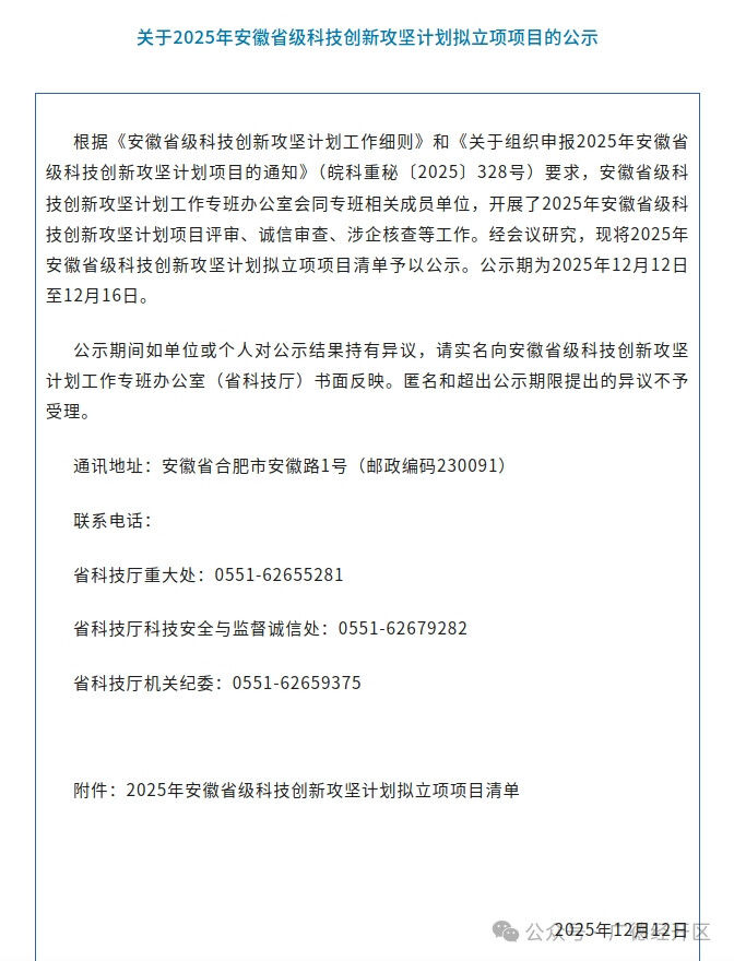 日前,安徽省级科技创新攻坚计划工作专班办公室会同专班相关成员单位,根据《安徽省级科技创新攻坚计划工作细则》等文件要求开展了2025年安徽省级科技创新攻坚计划项目评审、诚信审查、涉企核查等工作,并公示了《2025年安徽省级科技创新攻坚计划拟立项项目清单》。