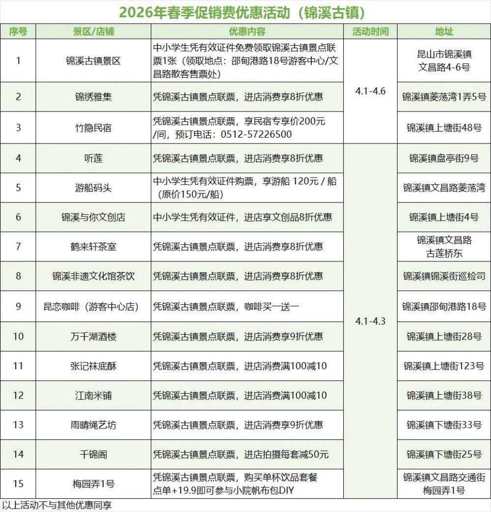 注:具体促销细则以商户现场说明为准,更多商户优惠可至锦溪古镇游客中心咨询。