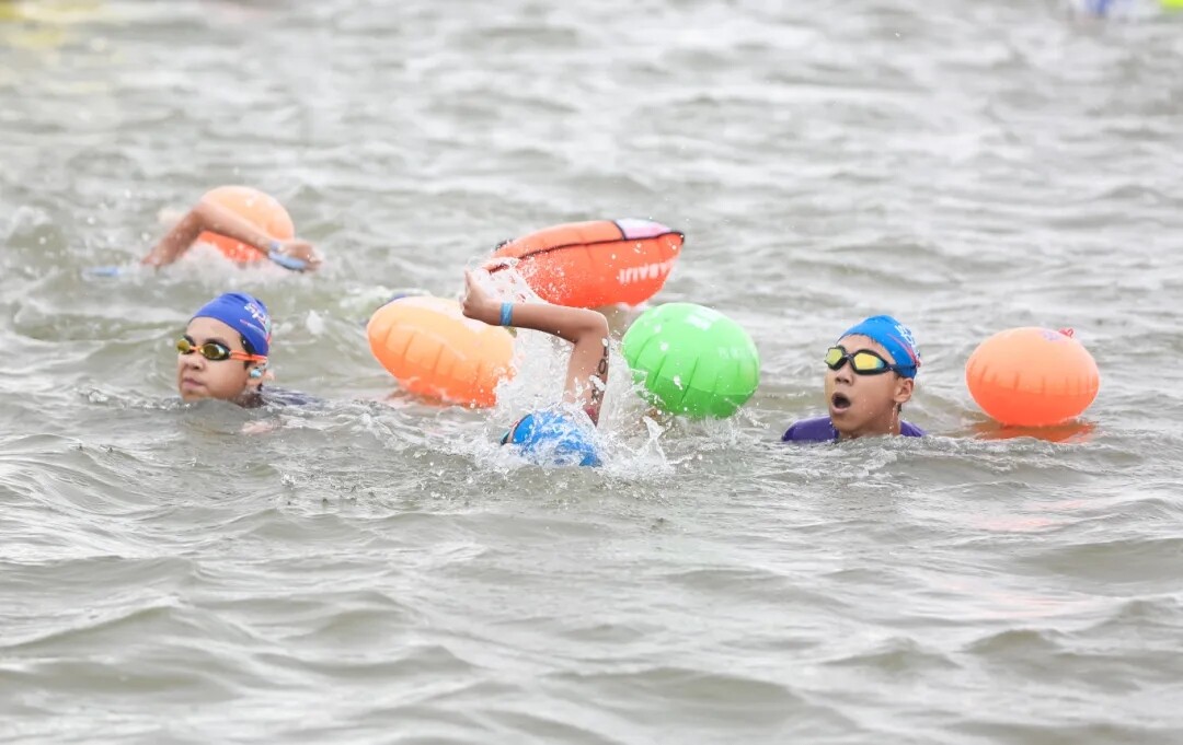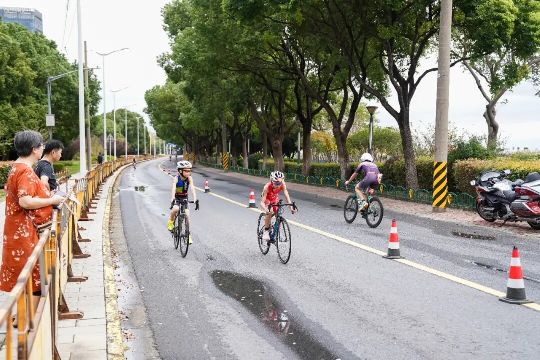 与此同时,2025年上海市青少年铁人三项锦标赛也在金山城市沙滩举行。近50名选手在风雨中相继完成游泳、骑行、跑步挑战,展现专业运动素养。