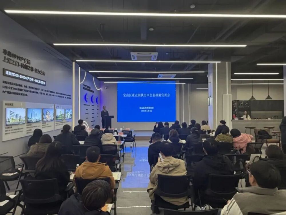 为深入贯彻落实国家及市、区稳外贸促发展决策部署,助力区内钢铁出口企业把握政策机遇,防范经营风险,提升国际竞争力,实现高质量发展,近日,宝山区商务委举办宝山区重点钢铁出口企业政策宣贯会,上海市商务委、吴淞海关等部门出席并指导;浦发银行上海分行、中信保上海分公司、碳衡科技、上海方达律师事务所等专业服务机构到场宣讲,宝山区三十余家重点钢铁出口企业负责人参会。